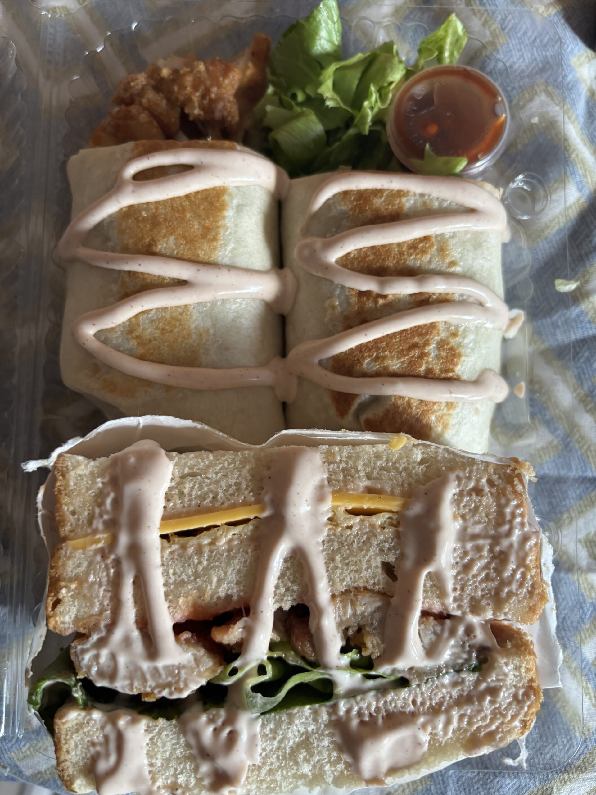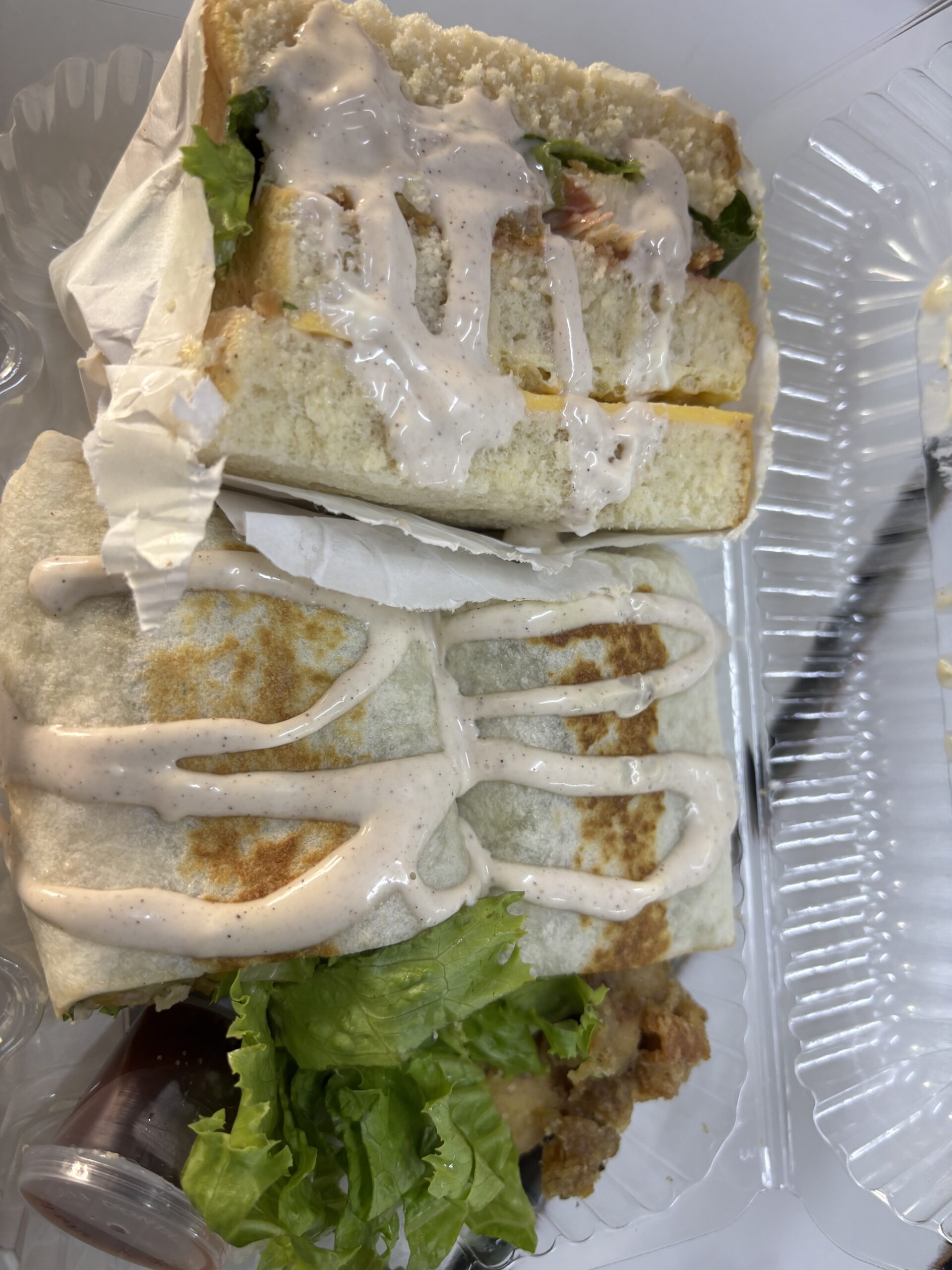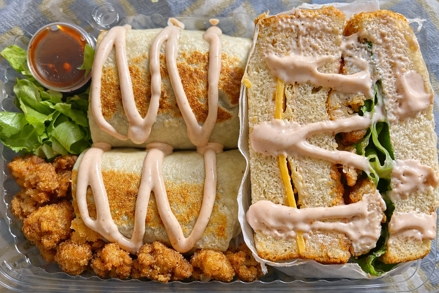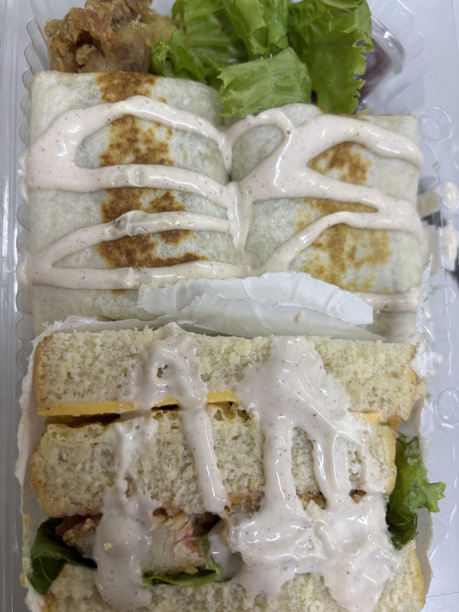 Perfect for those who love contrast—soft wraps, hearty sandwich, and crunchy bites—all beautifully packed in a clear clamshell, ready to grab and go.