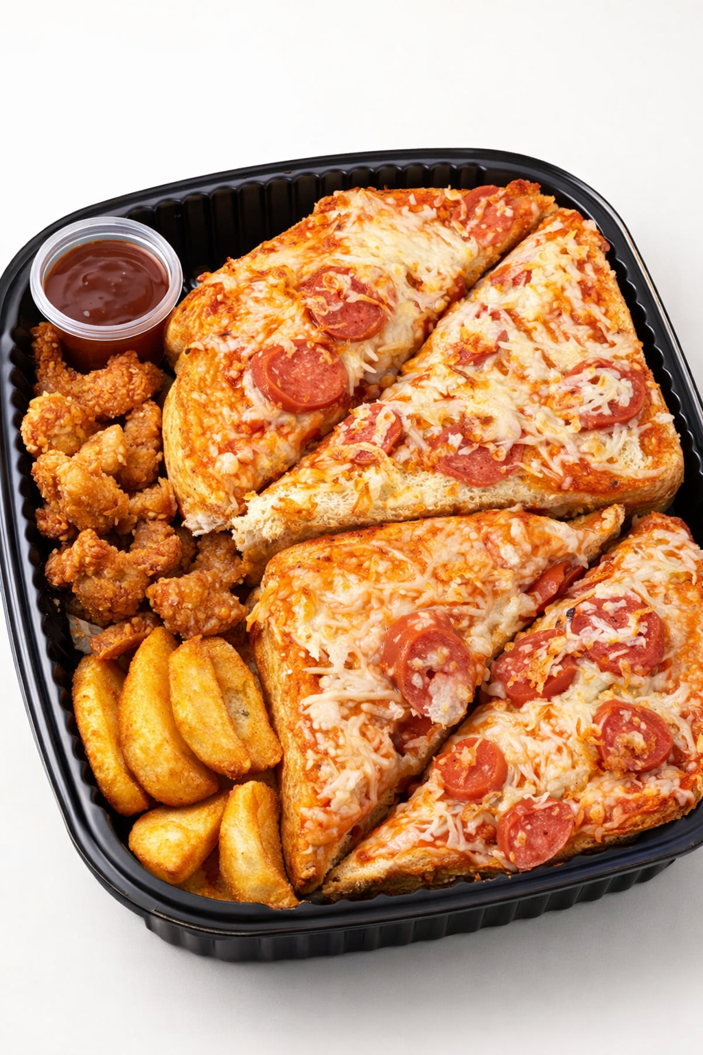 • A side of crispy popcorn chicken or golden potato wedges—your choice of crunch